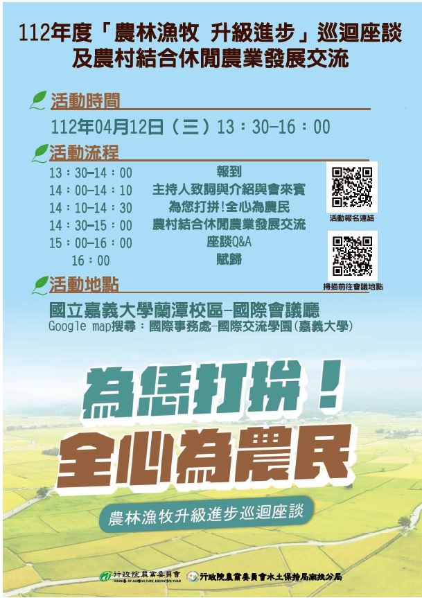 「農林漁牧 升級進步」巡迴座談來囉~ 4/12(三)下午13:30將於嘉義大學蘭潭校區國際會議中心,舉辦第二場次「農林漁牧 升級進步」巡迴座談及農村結合休閒農業發展交流,是農委會未來的新政策走向,關係到農林漁牧的未來發展,請大家多多支持到場參與。 各位夥伴趕緊【...
