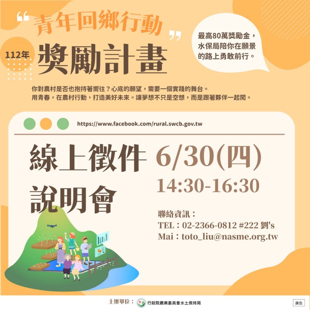 號召熱血青年提出農村再生新點子,用創意力與行動力,為農村發展注入新能量! 將於6月30日(四)14時30分於水保局臉書粉絲專頁「農村好讚」辦理線上徵件說明會,活動免報名,歡迎有興趣的熱血青年上線收看。說明會網址:https://www.facebook.com/rural.swcb.gov.tw 更...
