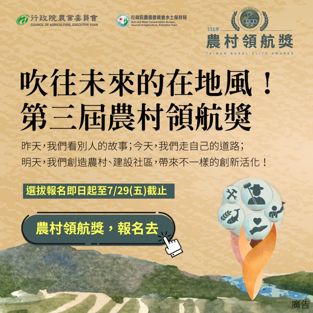 注意!注意!注意! 111年「第三屆農村領航獎」選拔開跑嘍! 你/妳是社區裡的優秀人才嗎?只要你對社區有貢獻都歡迎您的報名 水土保持局為表揚對農村社區發展貢獻卓越之個人,彰顯農村學習及發展之楷模。本屆遴選表現優異者30人。 一、選拔期程: 1.報名期間:即日起...