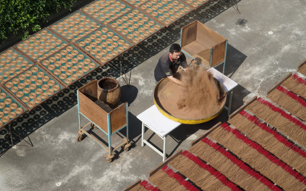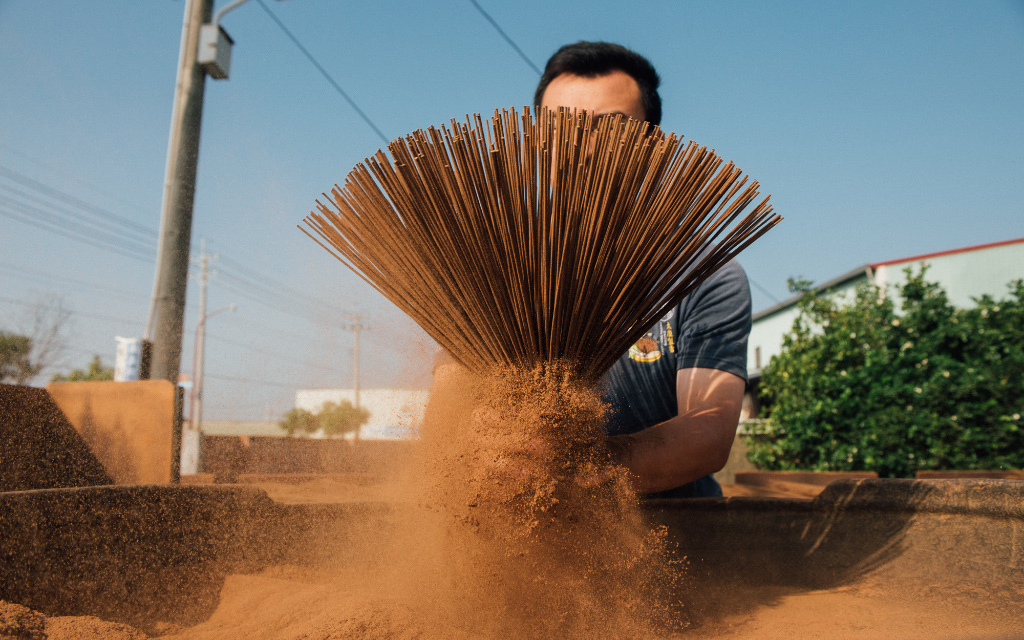 百年老店「大慶香舖」,香氣故事從一百五十年前幽幽點起,家族一代代人接續傳承。俐落地將竹芯進水,調好第一層的黏土打底,再將一隻隻竹芯裹上香粉,師傅老練的手沒有停歇,往往自己也被香粉裹得一身。在架子上披香陰乾,在院子裡日照曬香。