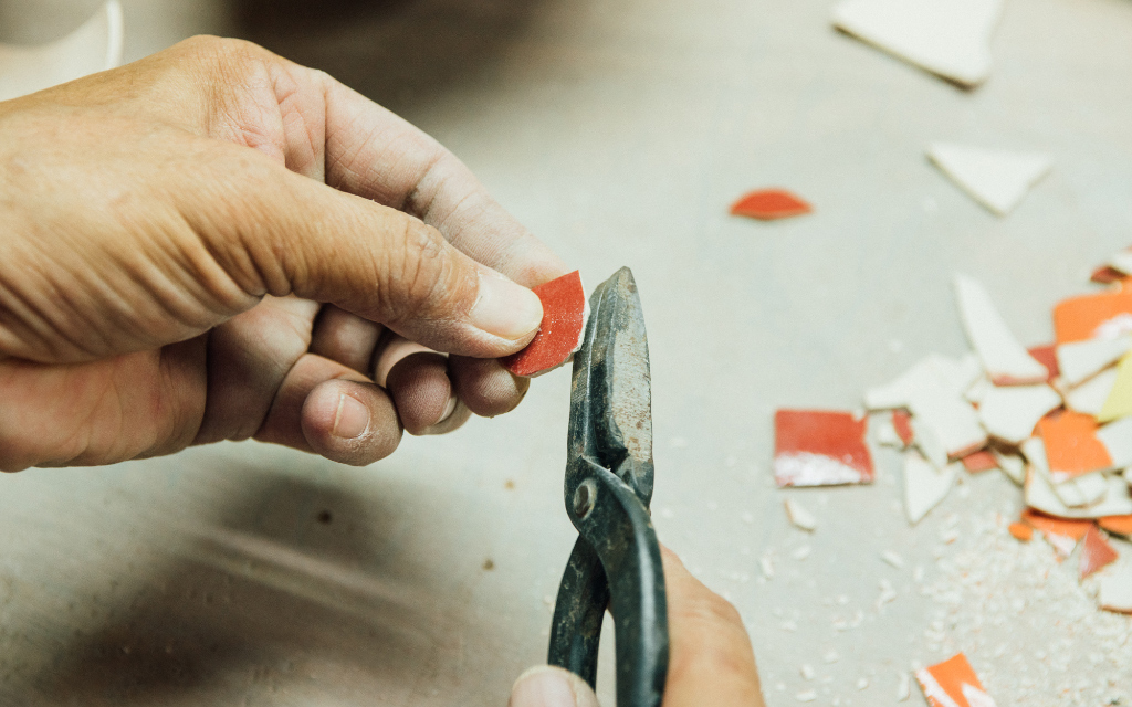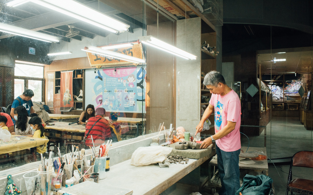 隔著玻璃窗,看工藝師專注地以「捏、堆、塑、貼、刻、劃」六大技巧塑形,刷上漂亮的釉色、經過釉燒,成為廟宇中色彩溫潤繽紛的交趾陶。玻璃窗外,遊人以不同的馬賽克拼磚,體驗剪黏獨特的設計與鑲嵌藝術。