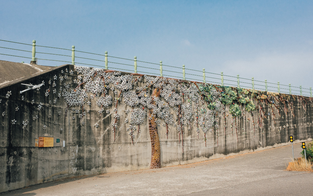 這樣的畫面被捕捉下來,成為在地的鮮明記憶,社區結合交趾陶及剪黏藝術,和苦楝變化多姿的四季,以堤防為揮灑的畫布,蒐集上百個酒甕和兩萬多個碗公,創作大型的作品《原鄉四季》。