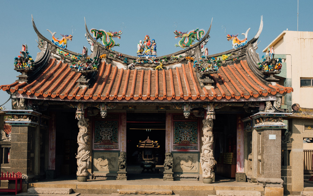 但走入這座廟宇,卻毫無沉重的歷史威攝之感,反而古樸親切,在這裡連時間都安靜沉緩起來,眼目所及是磨損刻痕的地面紅磚、精心雕刻的木造結構、簡白褪色的壁面浮雕,而殿中供奉著大禹帝、楚王項羽、伍子胥、屈原大夫、魯班公,皆為治水有功的「水中仙人」,庇蔭在地沿海居民的水運日常。