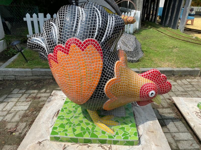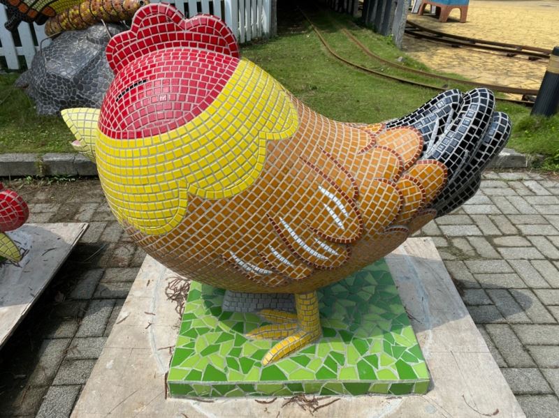 板頭社區自從農村再造後,吸引了很多觀光遊客入村遊玩拍照打卡,為了使板頭藝術村除了現有的陶板牆面適合拍照打卡,更能增加互動性裝置藝術,故於本期設計馬賽克裝置藝術,以農村常見的雞群為造型,以母難帶小雞的樣式,讓板頭村可提供社區營造的模範,帶領其它小雞一起來做社造,也可讓民眾能在雞背上面做出騎乘的動作,加上雞隻可愛俏皮的設計,能使更多人了解板頭藝術在傳統工藝上的推廣與傳承。