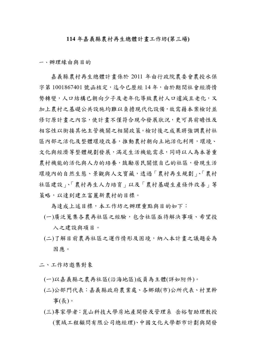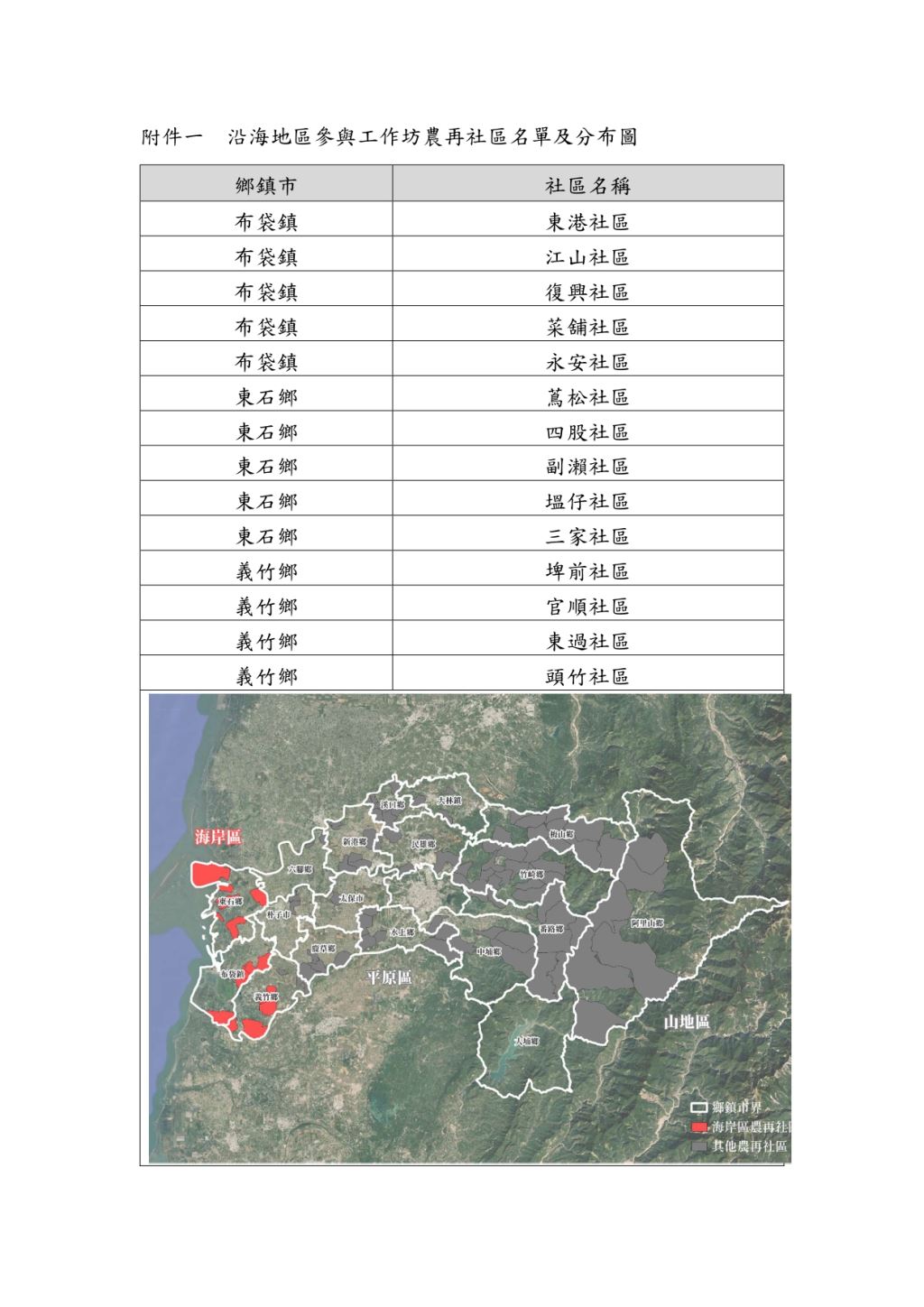 (一)以嘉義縣之農再社區(沿海區)成員為主體(詳如附件)。