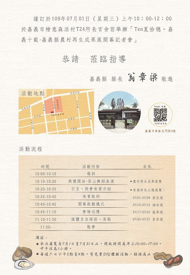 將於7/1(三)10:00-12:00嘉義市檜意森活村T24所長官舍前 舉辦「Ten夏拾穗。嘉義十載-嘉義縣農村再生成果展開幕記者會」,歡迎大家踴躍參加~