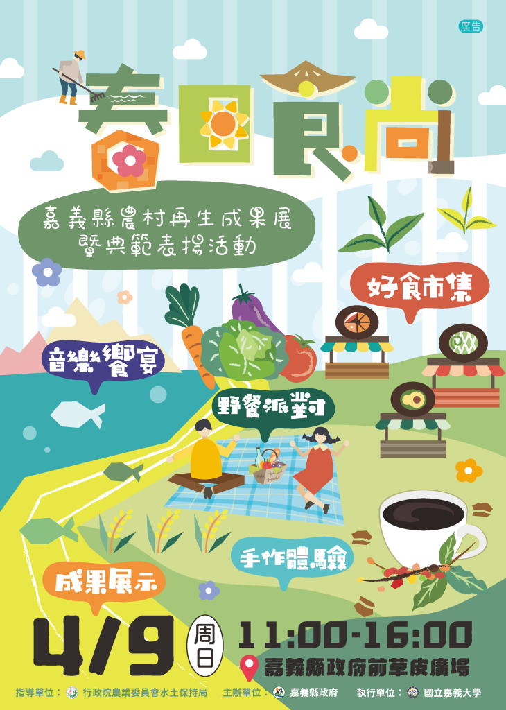 \ ✿春日食尚✕嘉義縣農村再生成果展✿ / 春遊哪裡去!? 4/9(日)將於嘉義縣政府前草皮廣場 舉辦「春日食尚✕嘉義縣農村再生成果展」.ᐟ.ᐟ 現場有本縣農再社區帶來精采的表演,還有野餐市集、DIY體驗活動、街頭藝人表演以及農村再生歷年成果展示,讓您可以邊逛邊...