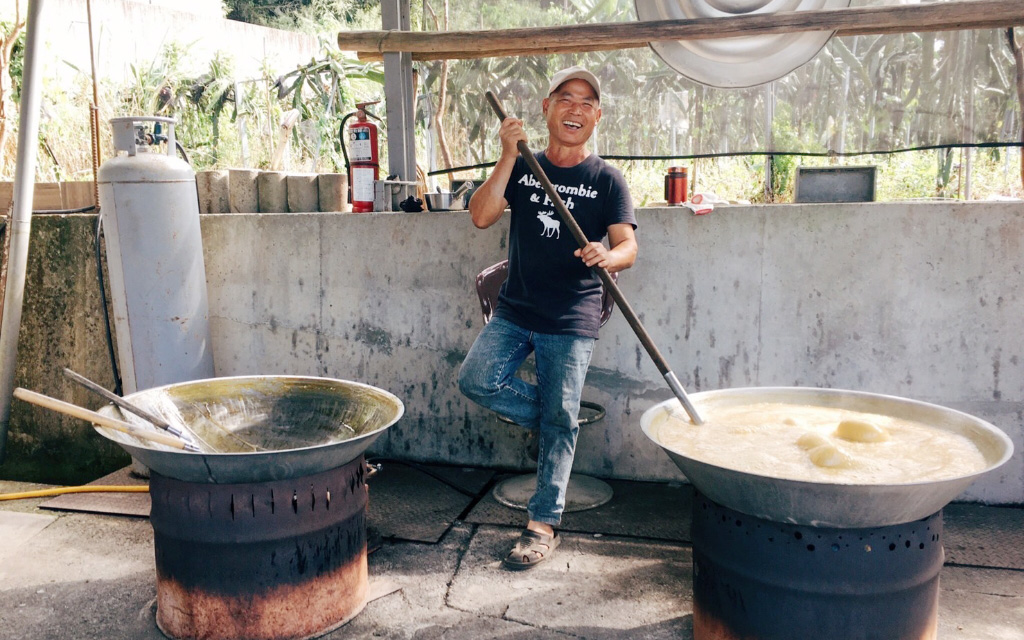 每年冬至到農曆期間便是茶山地區的採收期,會將採收好的白甘蔗先剝除葉子,一枝枝放入榨汁機中,收集蔗汁。接著便要過濾汁液中的雜質,需要邊大鍋加熱,邊使用濾網重複過濾至少三次;再來分裝到小鍋,慢火熬煮半小時以蒸發多餘的養分,為了避免底部燒焦,期間必須不斷手持攪拌。